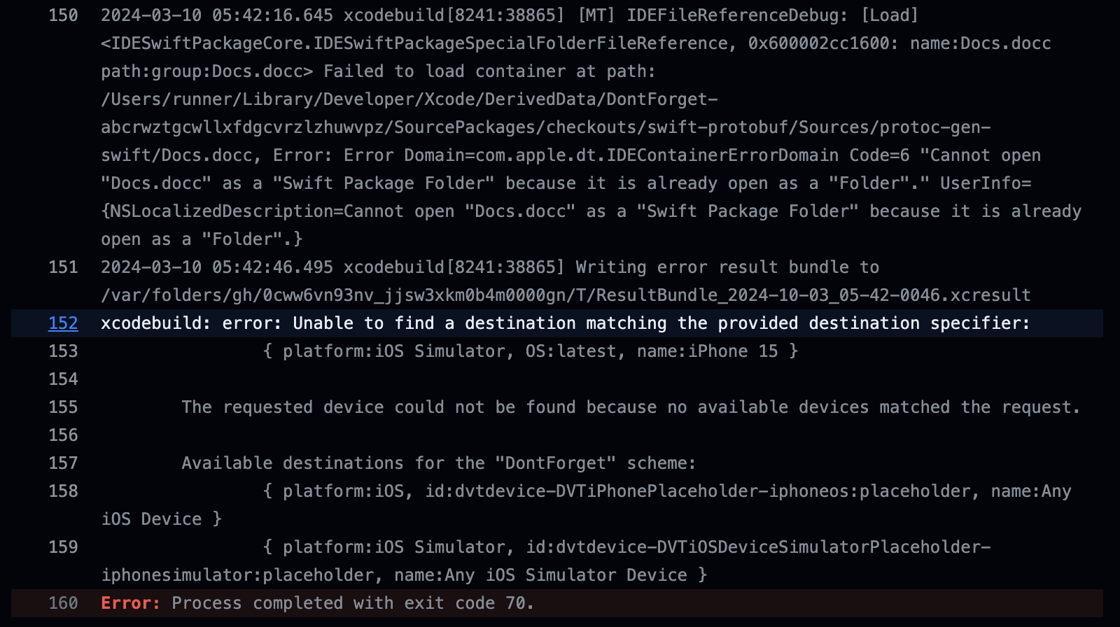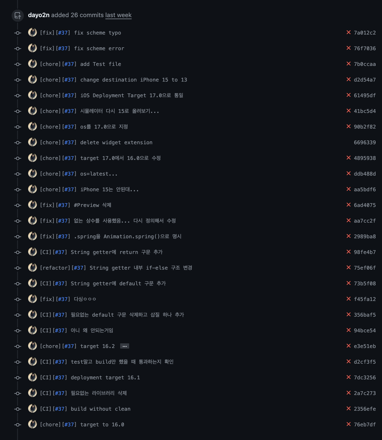 여기서부터 iOS Deployment target을 16.0으로 내렸다: widget extension(미리 추가해둔거라 아무것도 없음) 삭제, 17.0 이상부터 사용 가능한 API들 모두 수정했다. #Preview와 같이 Swift 5.9의 매크로 문법을 못알아먹은 에러도 있었는데, 해당 버전의 문법을 다 삭제했다. 실행할 기기도 iPhone 15도 iPhone 14로 변경.