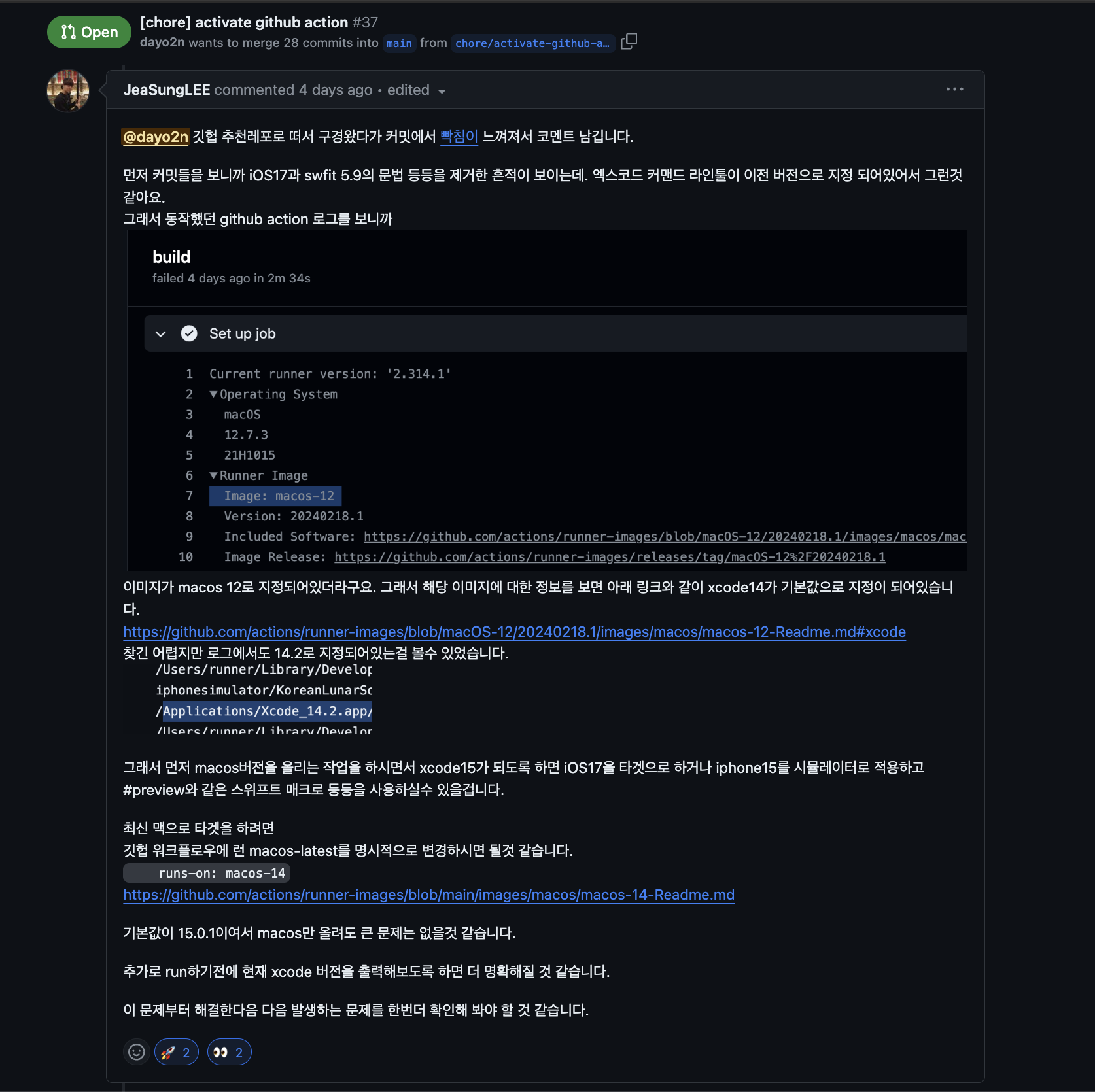 재르시께서 참고자료와 설명을 세세하게 알려주셔서 금방 파악할 수 있었다. 나는 맥 버전을 macos-lastest로 작성하였기 때문에 운영체제 버전 문제일줄은 몰랐는데, macos12로 돌아가고 있었던 거다. 러너 이미지를 까볼 수 있다는 것도 알게되었다. github actions의 runner-images repo에서 macos버전마다 이미지마다 상세정보를 볼 수 있고 여기서 쓸 수 있는 xcode 버전도 확인할 수 있다.